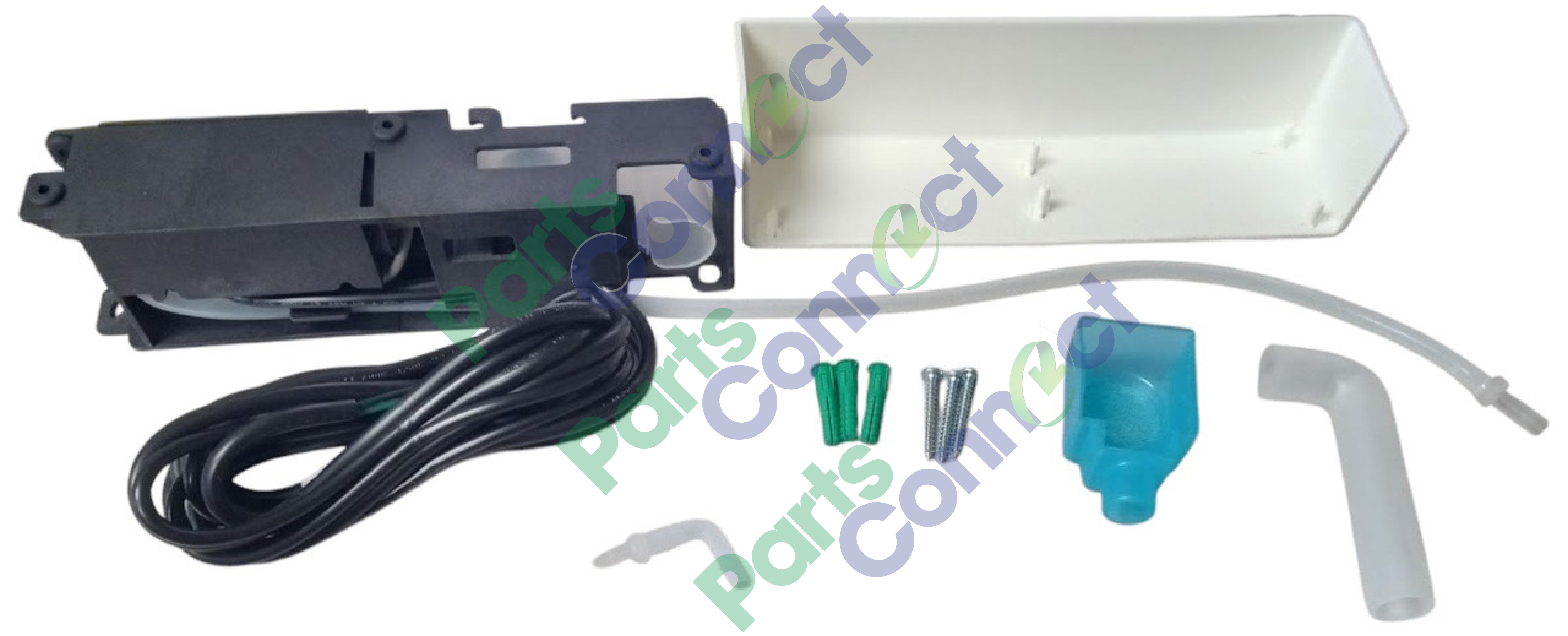 A compact, wall-mounted condensate removal pump designed for air conditioning systems. Its versatile design allows for four installation configurations: horizontally or vertically, on either side of the air conditioner